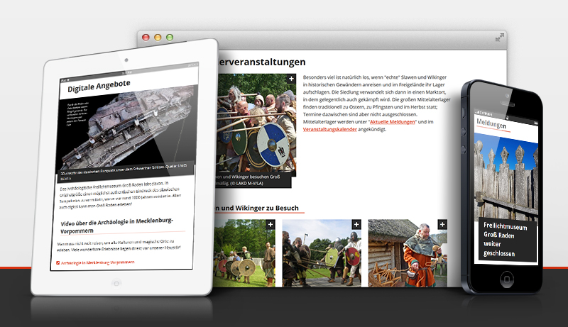 Das Archäologische Freilichtmuseum Groß Raden nimmt große und kleine Entdecker mit auf eine spannende Reise in eine andere Welt, in die Slawenzeit, über 1000 Jahre zurück in die Vergangenheit. Das spiegelt auch die Museums-Website wider: Modern und schlicht im Design, vermittelt sie gleichzeitig eine urtümliche Atmosphäre und lädt zu einem Besuch des Freilichtmuseums ein. Mit viel Herzblut hat unsere Internetagentur die Site in zeitgemäßer, responsiver und barrierearmer Gestaltung gerelauncht.