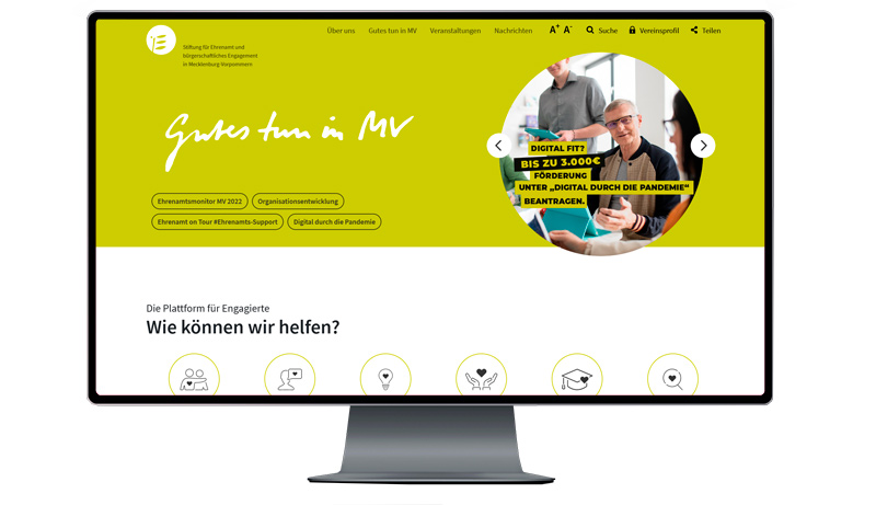 Seit 2015, als die Idee zur Gründung einer Stiftung für Ehrenamt und bürgerliches Engagement in Mecklenburg-Vorpommern entstand, begleiten wir den digitalen Auftritt der Ehrenamtsstiftung. Die Stiftung unterstützt, berät und vernetzt Menschen, die Gutes tun in M-V, die sich einbringen mit Ideen und sich mit viel Herz für ihre Mitmenschen engagieren.